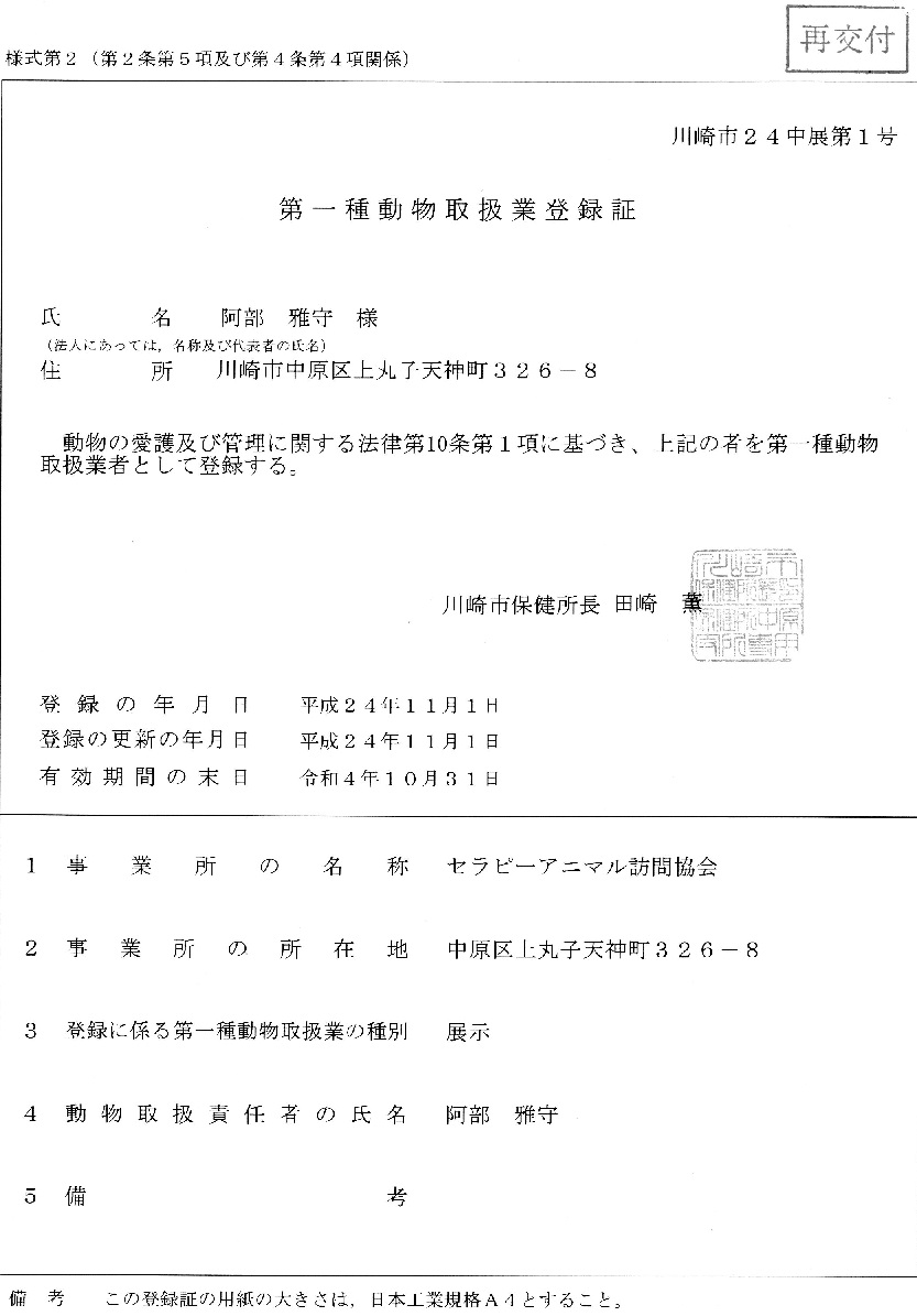■ 動物取扱業登録証 ■